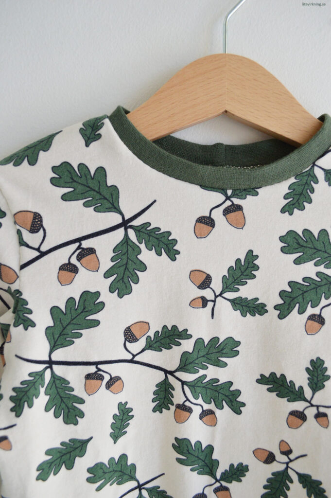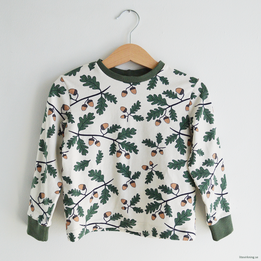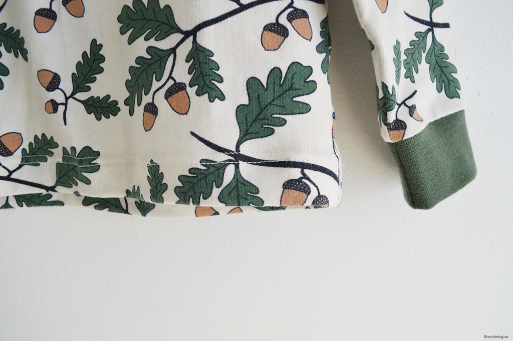 När jag väl satte igång och sy tröjan så gick det snabbt. Det är ju det som är med sömnad, när man väl sätter igång får man resultat fort! Jag tog mig också tiden att sy upp nedre delen av tröjan med tvillingnål, vilket jag tycker ger ett snyggt resultat. Blev verkligen nöjd med tröjan och tycker mönstret på tyget är så fint! Passar speciellt bra nu på höstkanten när alla löv och ekollon faller ner på marken. Nu har jag gett iväg tröjan till en 2-åring och den såg ut att passa bra på honom, så det var ju roligt.