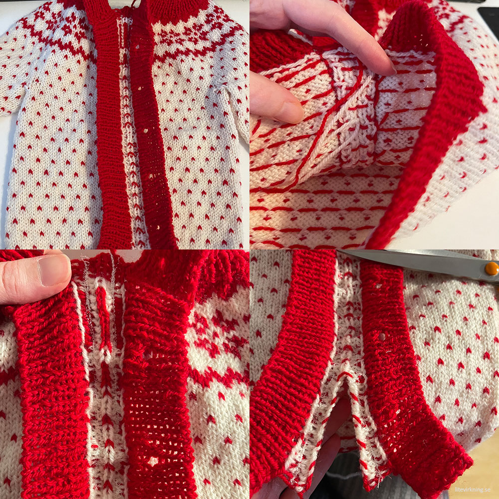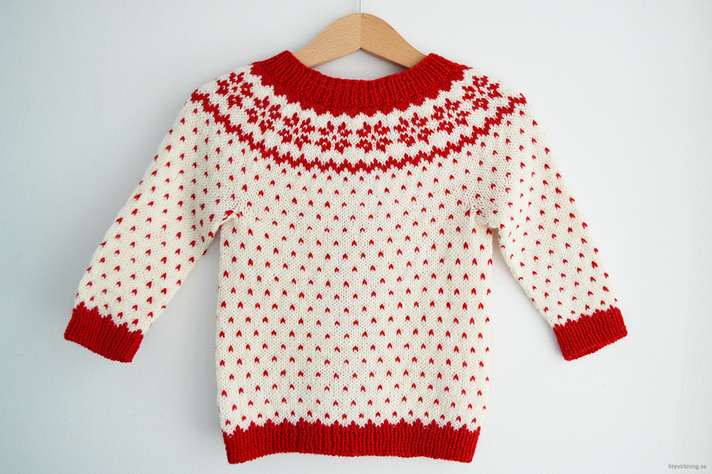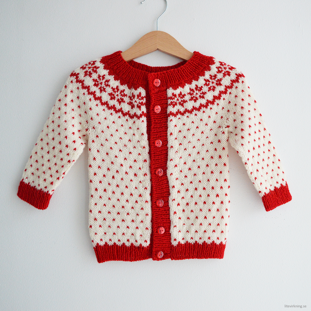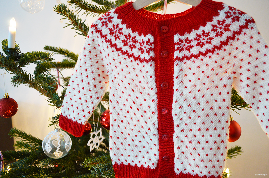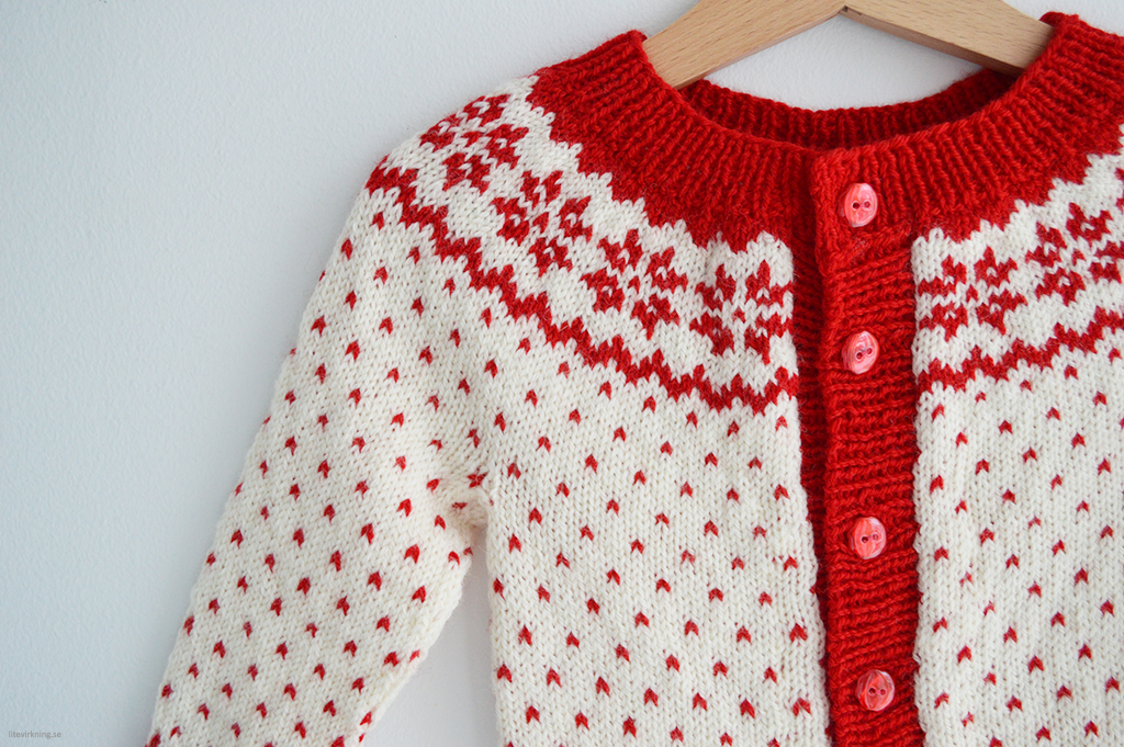 Ända sedan Järbo släppte kollektionen där Vetle serien var med så har jag velat sticka något mönster ur den. På mönsterbilderna är de uppstickade i vitt och bruna nyanser vilket är så himla fint. Dock säljer järbo inte längre garnet som plaggen är uppstickade i så man får leta alternativ om man vill ha just dom färgerna. Efter att ha stickat av stashen i många månader så blev jag sugen på att beställa lite garn till småprojekt, och ett av projekten jag ville göra var just Vetle, eftersom julen närmade sig så kände jag att det vore roligt att sticka något som känns lite juligt under december månad. Sagt och gjort så beställde jag garn i rött och vitt för att sticka en liten julig variant av Vetle Babycardigan.